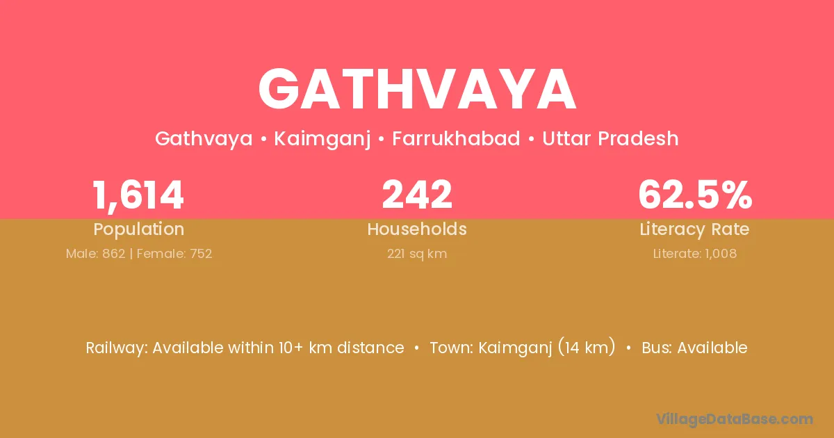 Kaimganj (14 km) is the nearest town to Gathvaya village for major economic activities and is located approximately 14 km away.