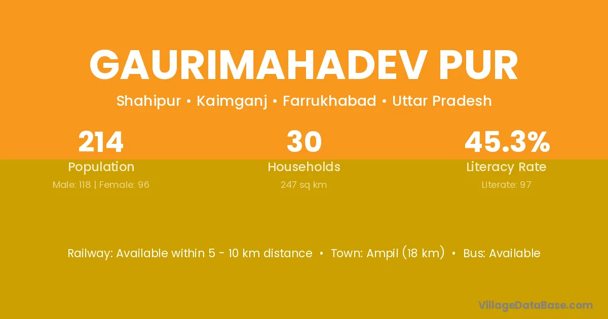 Gaurimahadev Pur village has a total population of 214 people, of which 118 are males and 96 are females.