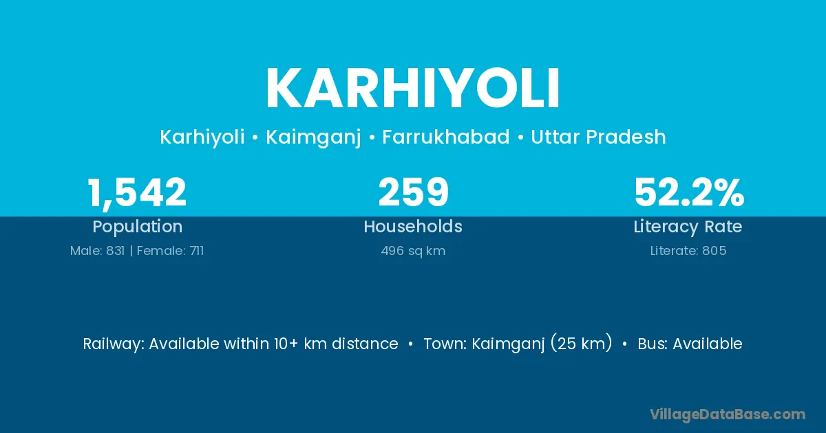 Kaimganj (25 km) is the nearest town to Karhiyoli village for major economic activities and is located approximately 25 km away.