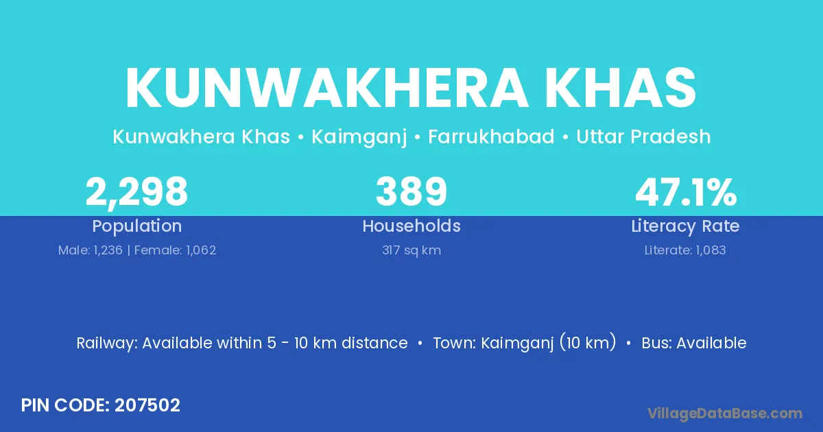Kaimganj (10 km) is the nearest town to Kunwakhera Khas village for major economic activities and is located approximately 10 km away.