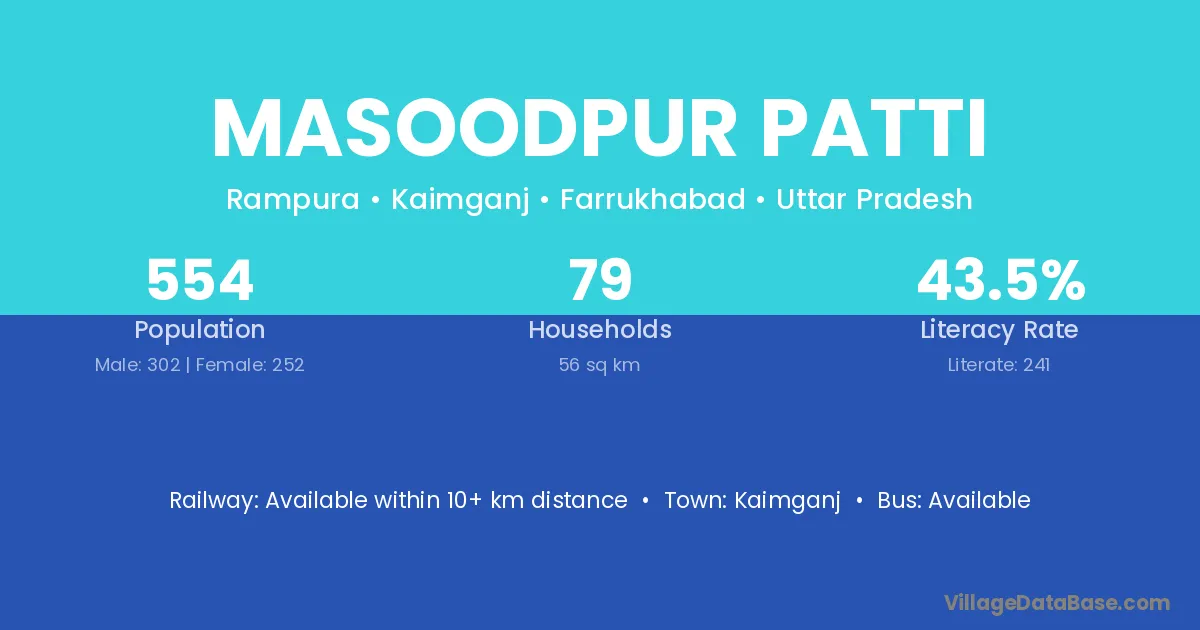 Masoodpur Patti village has a total population of 554 people, of which 302 are males and 252 are females.
