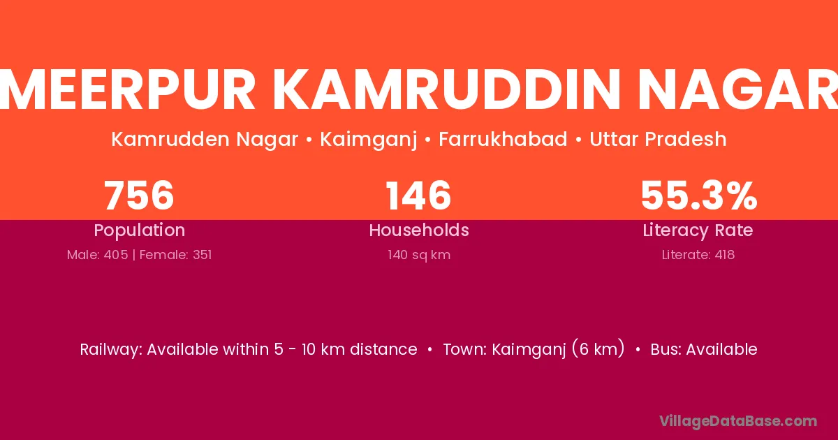 Kaimganj (6 km) is the nearest town to Meerpur Kamruddin Nagar village for major economic activities and is located approximately 6 km away.
