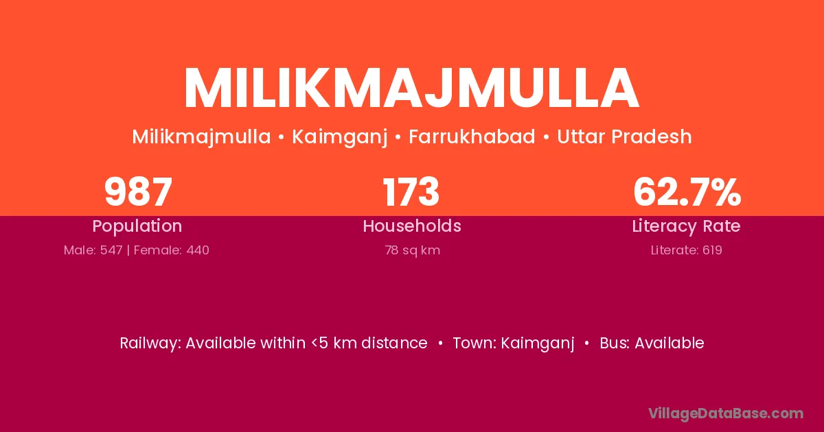 Milikmajmulla village has a total population of 987 people, of which 547 are males and 440 are females.