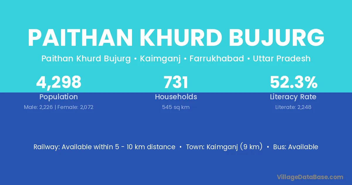 Kaimganj (9 km) is the nearest town to Paithan Khurd Bujurg village for major economic activities and is located approximately 9 km away.