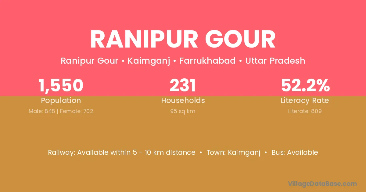 Ranipur Gour village has a total population of 1,550 people, of which 848 are males and 702 are females.
