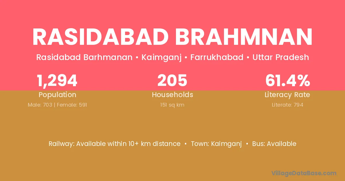 Rasidabad Brahmnan village has a total population of 1,294 people, of which 703 are males and 591 are females.