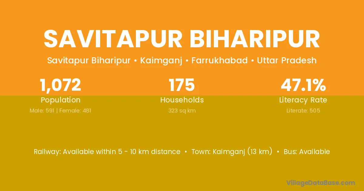 Kaimganj (13 km) is the nearest town to Savitapur Biharipur village for major economic activities and is located approximately 13 km away.