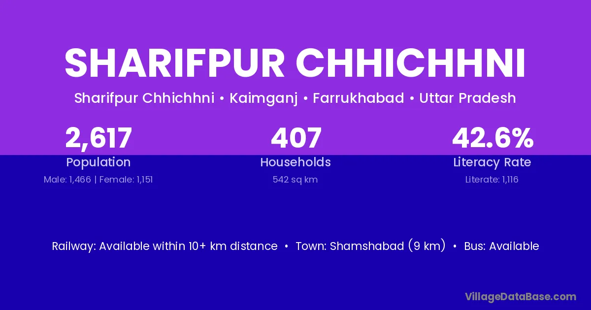 Shamshabad (9 km) is the nearest town to Sharifpur Chhichhni village for major economic activities and is located approximately 9 km away.
