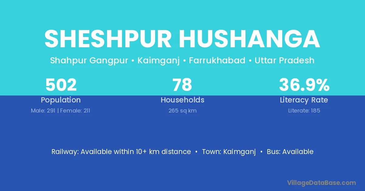 Sheshpur Hushanga village has a total population of 502 people, of which 291 are males and 211 are females.