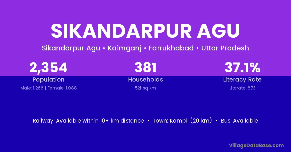 Kampil (20 km) is the nearest town to Sikandarpur Agu village for major economic activities and is located approximately 20 km away.