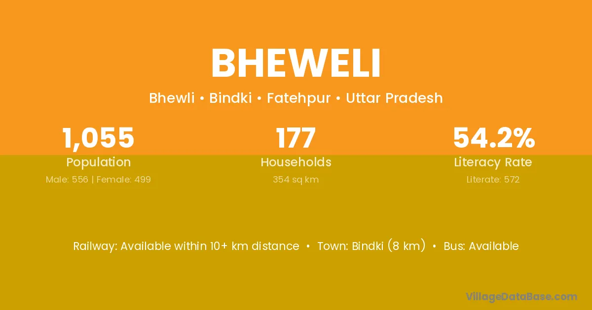 Bindki (8 km) is the nearest town to Bheweli village for major economic activities and is located approximately 8 km away.