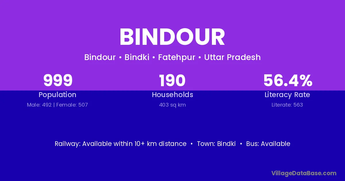 Bindour village has a total population of 999 people, of which 492 are males and 507 are females.