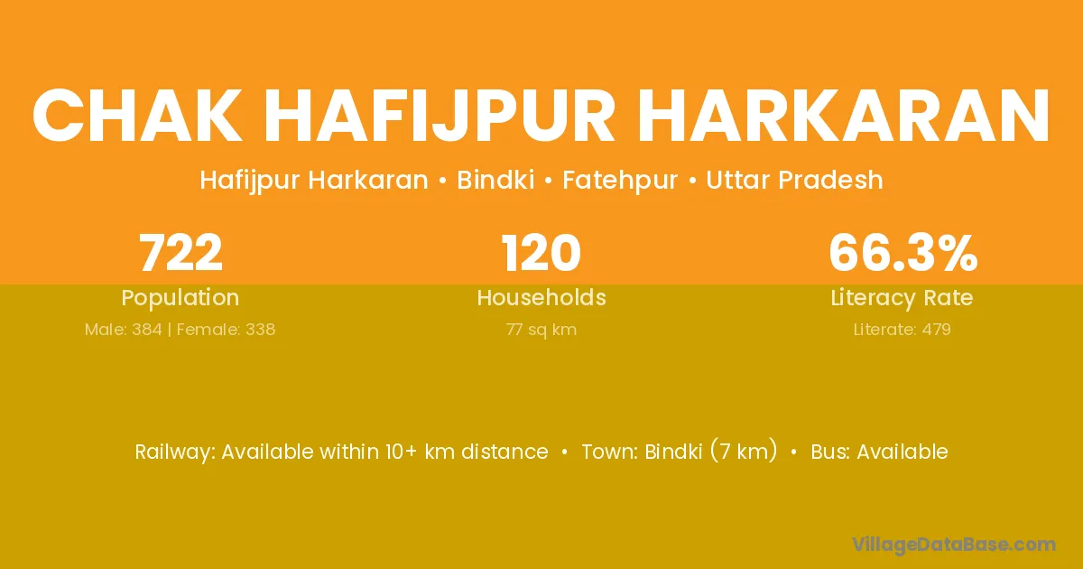Bindki (7 km) is the nearest town to Chak Hafijpur Harkaran village for major economic activities and is located approximately 7 km away.