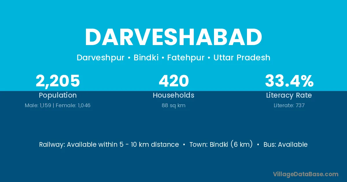 Bindki (6 km) is the nearest town to Darveshabad village for major economic activities and is located approximately 6 km away.