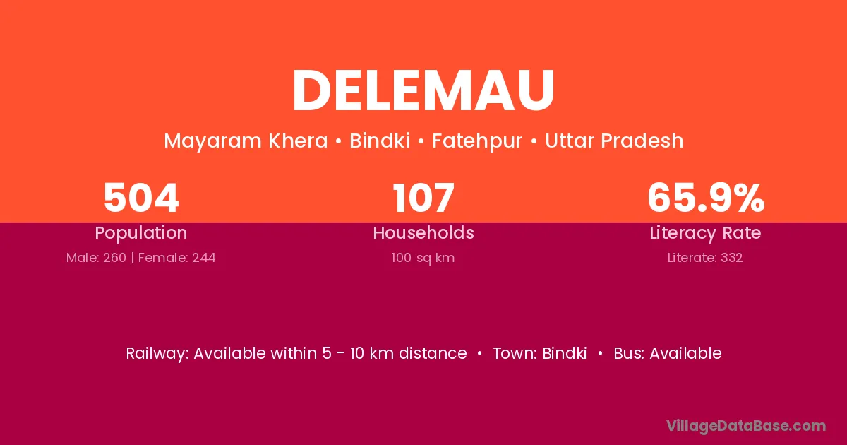 Delemau village has a total population of 504 people, of which 260 are males and 244 are females.