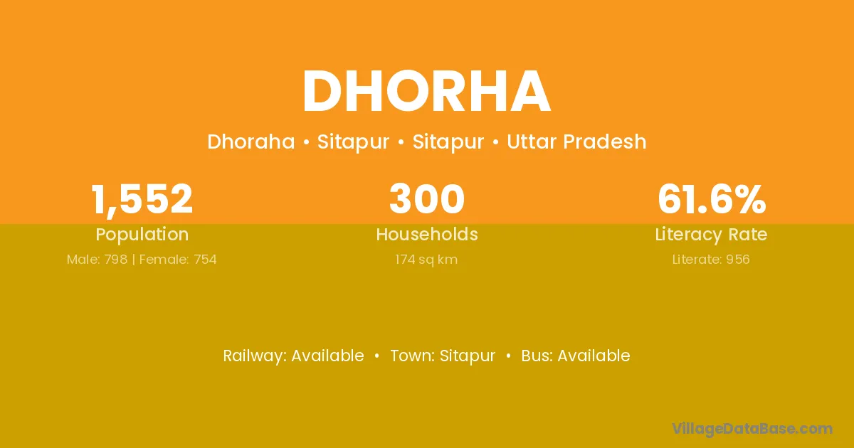 The literacy rate of Dhorha village is 59.47%. Male literacy stands at 67.93% and female literacy at 50.14%.