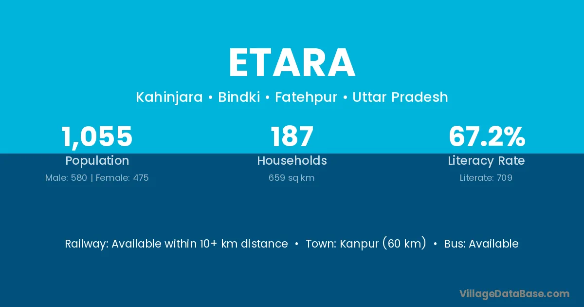 Kanpur (60 km) is the nearest town to Etara village for major economic activities and is located approximately 60 km away.