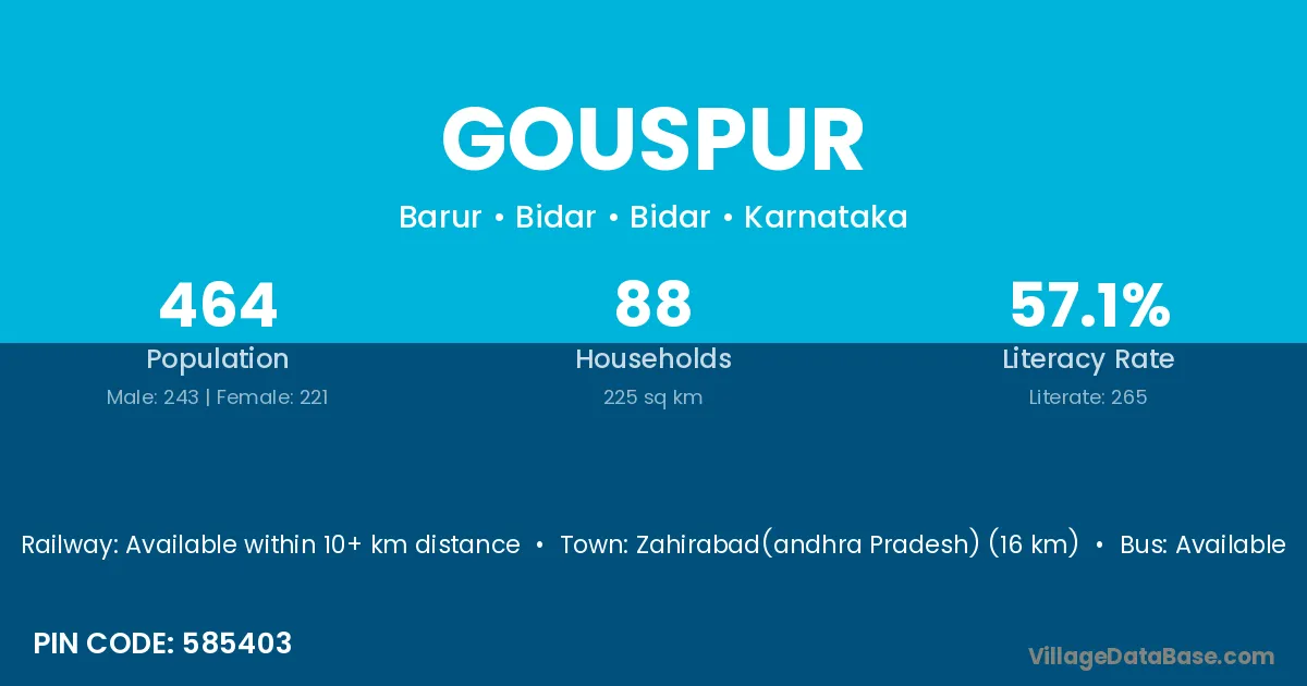 The literacy rate of Gouspur village is 45.97%. Male literacy stands at 56.96% and female literacy at 33.33%.
