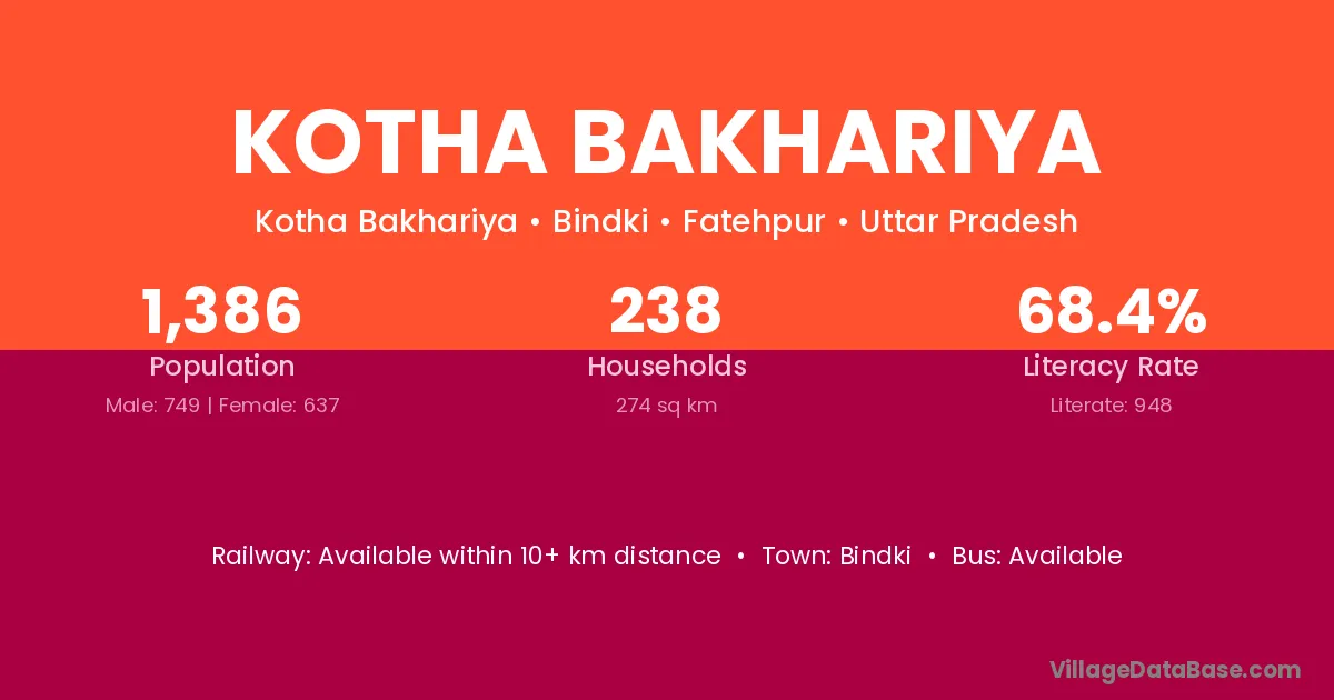 Kotha Bakhariya village has a total population of 1,386 people, of which 749 are males and 637 are females.