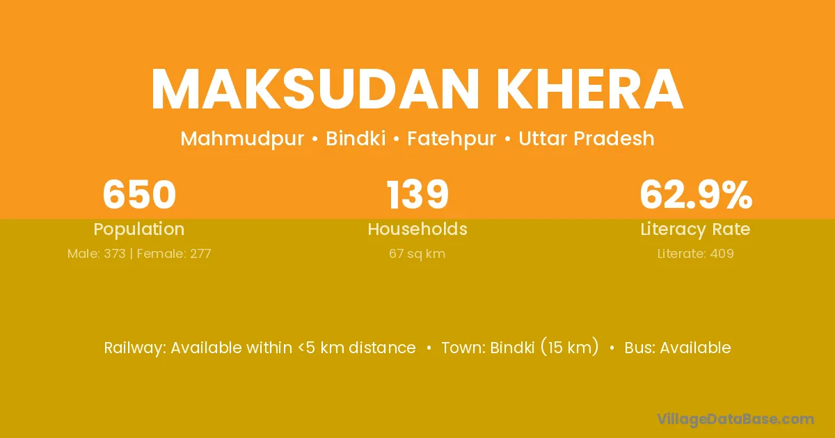 Bindki (15 km) is the nearest town to Maksudan Khera village for major economic activities and is located approximately 15 km away.