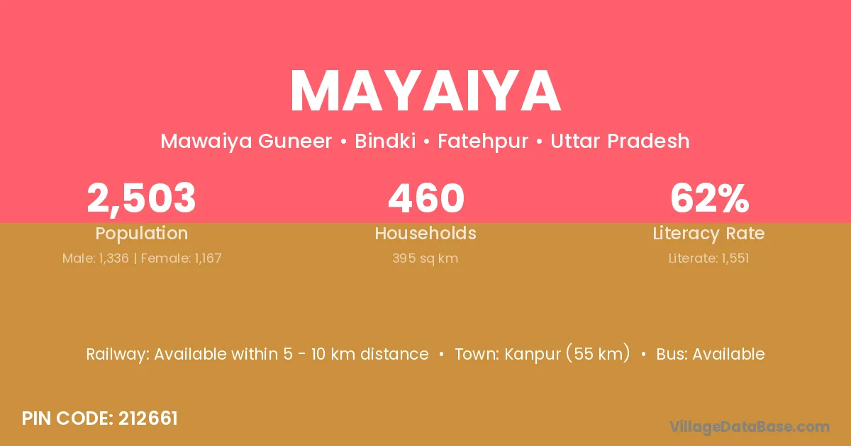 Kanpur (55 km) is the nearest town to Mayaiya village for major economic activities and is located approximately 55 km away.