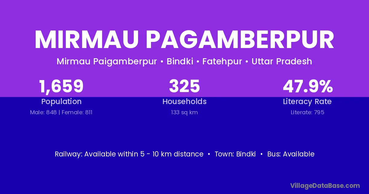 Mirmau Pagamberpur village has a total population of 1,659 people, of which 848 are males and 811 are females.