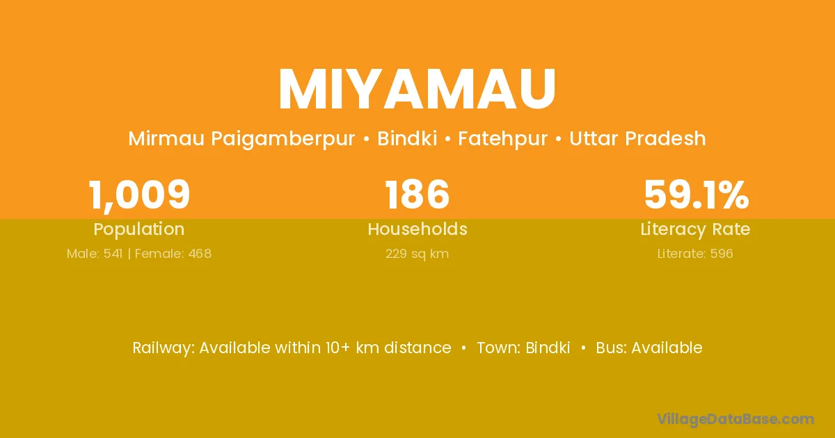 Miyamau village has a total population of 1,009 people, of which 541 are males and 468 are females.