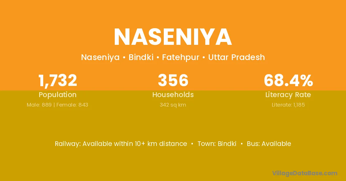 Naseniya village has a total population of 1,732 people, of which 889 are males and 843 are females.