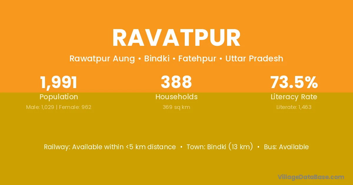 Bindki (13 km) is the nearest town to Ravatpur village for major economic activities and is located approximately 13 km away.