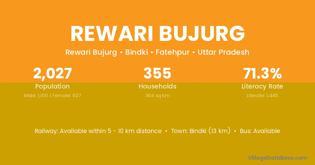 Bindki (13 km) is the nearest town to Rewari Bujurg village for major economic activities and is located approximately 13 km away.