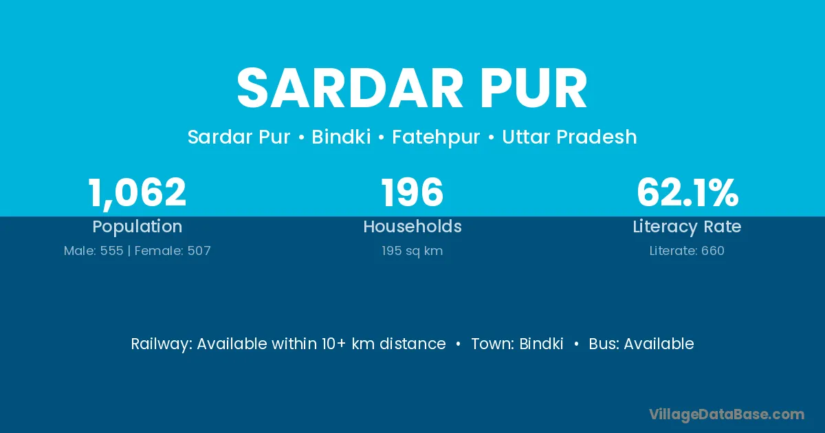 Sardar Pur village has a total population of 1,062 people, of which 555 are males and 507 are females.