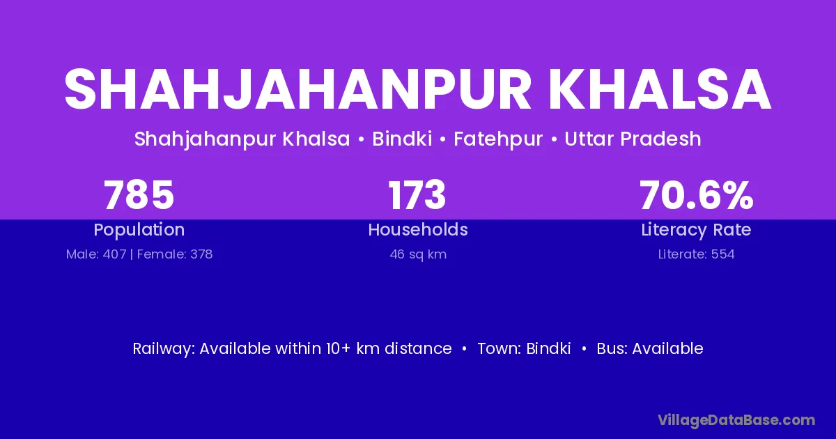 Shahjahanpur Khalsa village has a total population of 785 people, of which 407 are males and 378 are females.