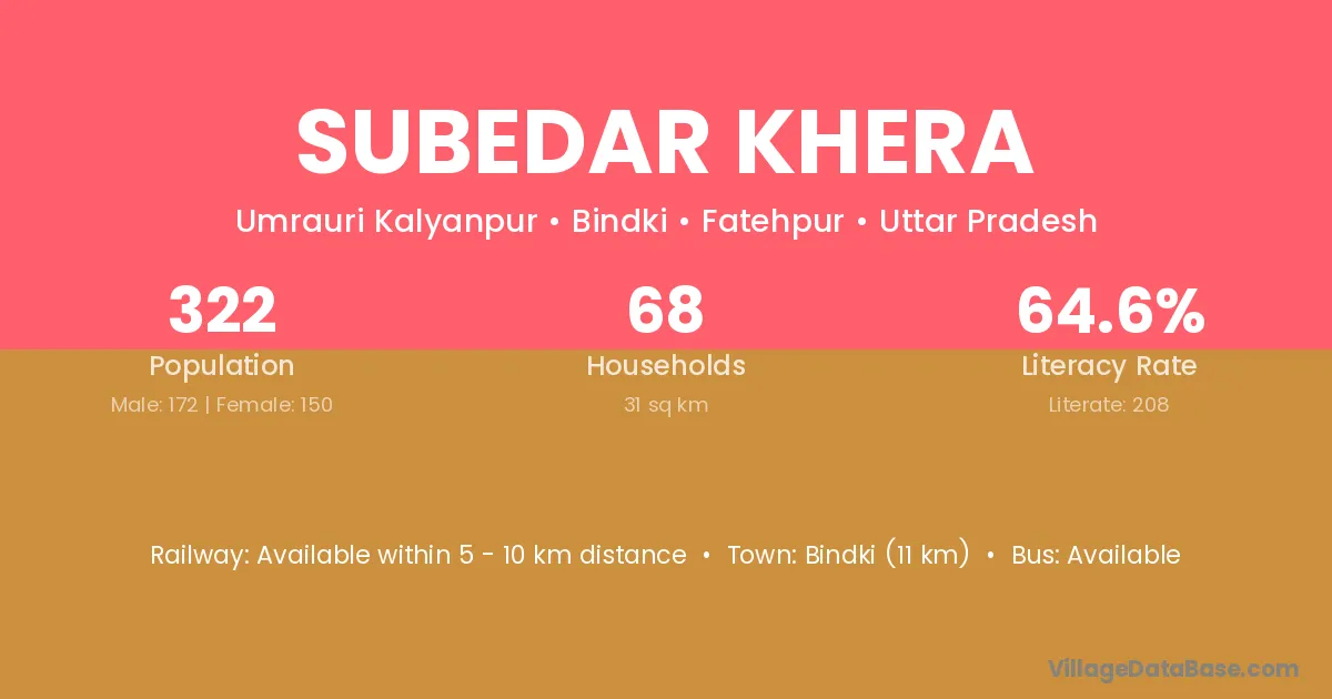 Bindki (11 km) is the nearest town to Subedar Khera village for major economic activities and is located approximately 11 km away.