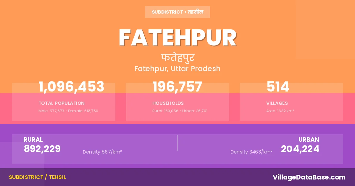 According to the 2011 census The total area of Fatehpur Tehsil is 1632 km², with a population of 1096453 people. The population density is 672 inhabitants per square kilometre, and there are approximately 196757 houses in the sub district.