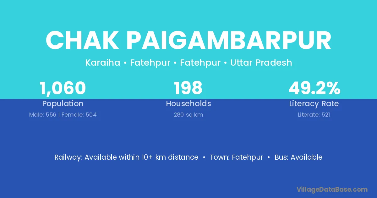 Chak Paigambarpur village has a total population of 1,060 people, of which 556 are males and 504 are females.