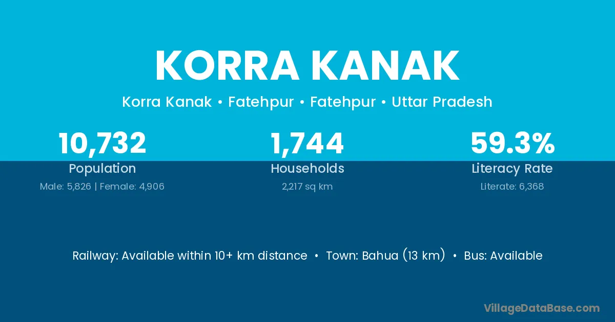Korra Kanak village has a total population of 10,732 people, of which 5,826 are males and 4,906 are females.