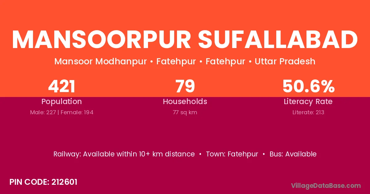 Mansoorpur Sufallabad village has a total population of 421 people, of which 227 are males and 194 are females.