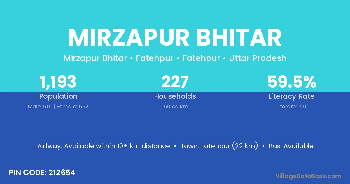 Fatehpur (22 km) is the nearest town to Mirzapur Bhitar village for major economic activities and is located approximately 22 km away.