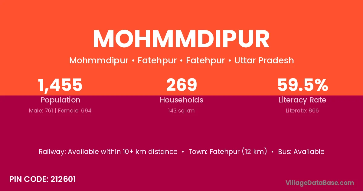 Fatehpur (12 km) is the nearest town to Mohmmdipur village for major economic activities and is located approximately 12 km away.
