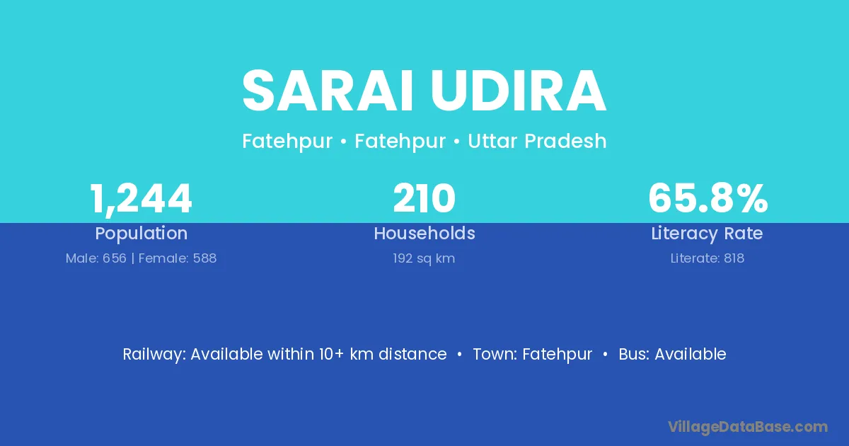 Sarai Udira village has a total population of 1,244 people, of which 656 are males and 588 are females.