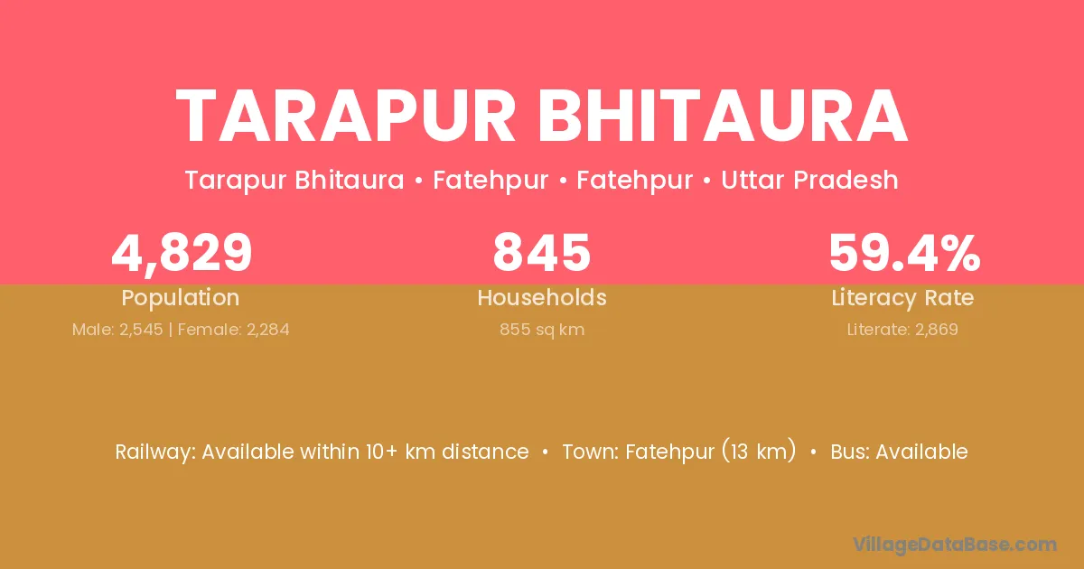 Fatehpur (13 km) is the nearest town to Tarapur Bhitaura village for major economic activities and is located approximately 13 km away.