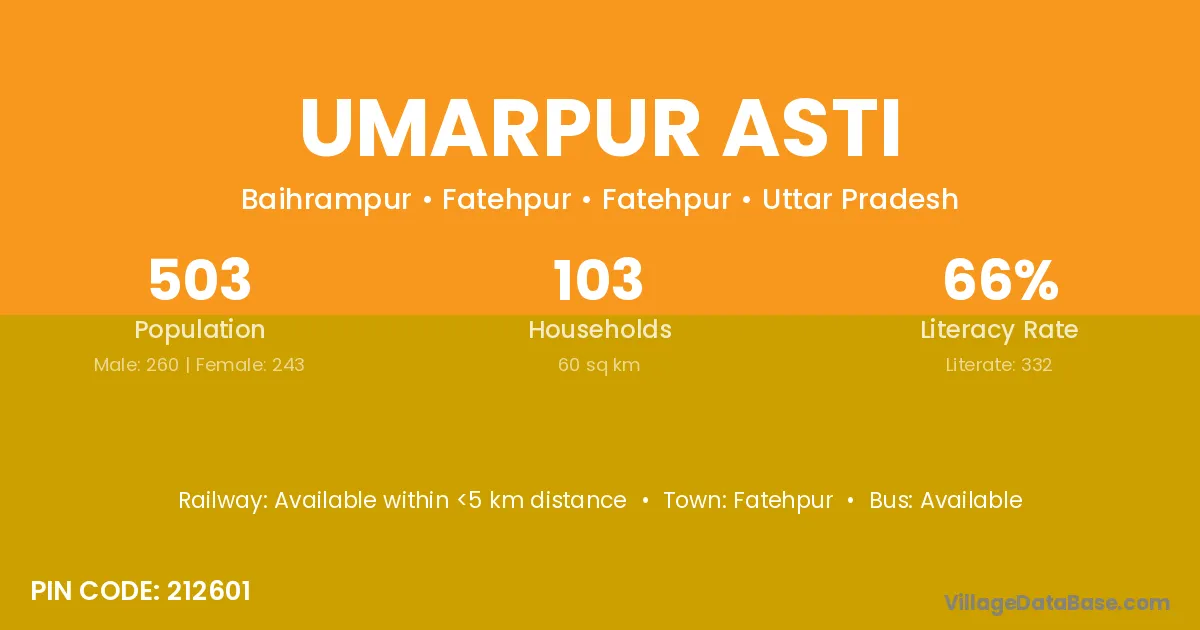 Umarpur Asti village has a total population of 503 people, of which 260 are males and 243 are females.