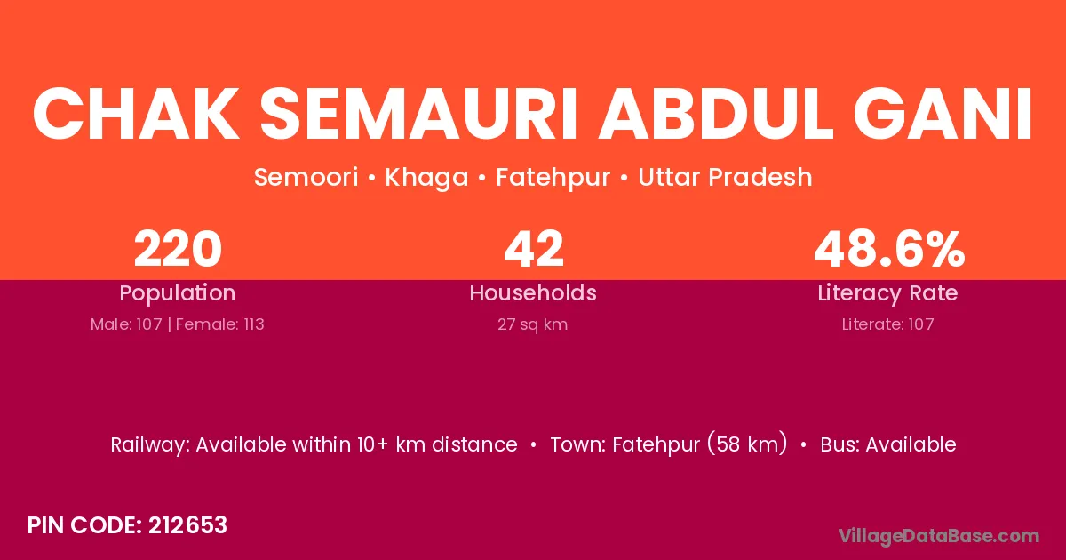 Chak Semauri Abdul Gani village has a total population of 220 people, of which 107 are males and 113 are females.