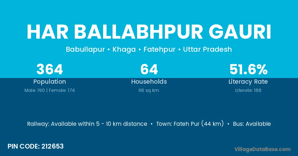Har Ballabhpur Gauri village has a total population of 364 people, of which 190 are males and 174 are females.
