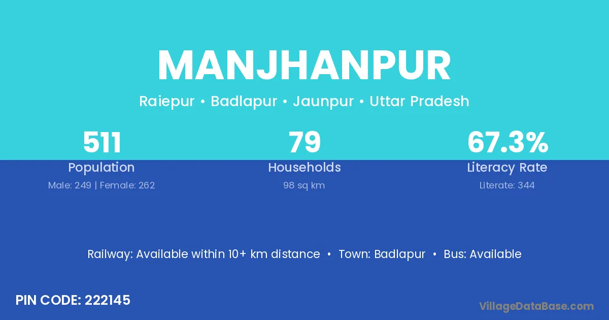 The literacy rate of Manjhanpur village is 60.41%. Male literacy stands at 72.74% and female literacy at 47.50%.