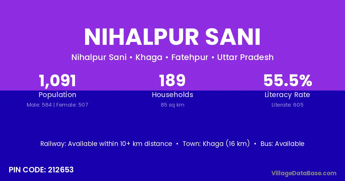Khaga (16 km) is the nearest town to Nihalpur Sani village for major economic activities and is located approximately 16 km away.