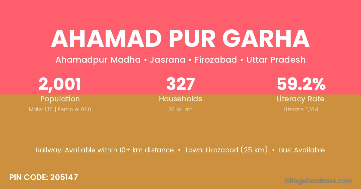 Firozabad (25 km) is the nearest town to Ahamad Pur Garha village for major economic activities and is located approximately 25 km away.