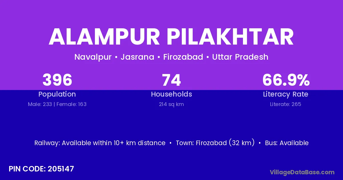 Firozabad (32 km) is the nearest town to Alampur Pilakhtar village for major economic activities and is located approximately 32 km away.