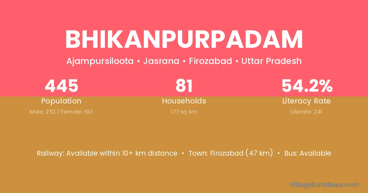 Firozabad (47 km) is the nearest town to Bhikanpurpadam village for major economic activities and is located approximately 47 km away.