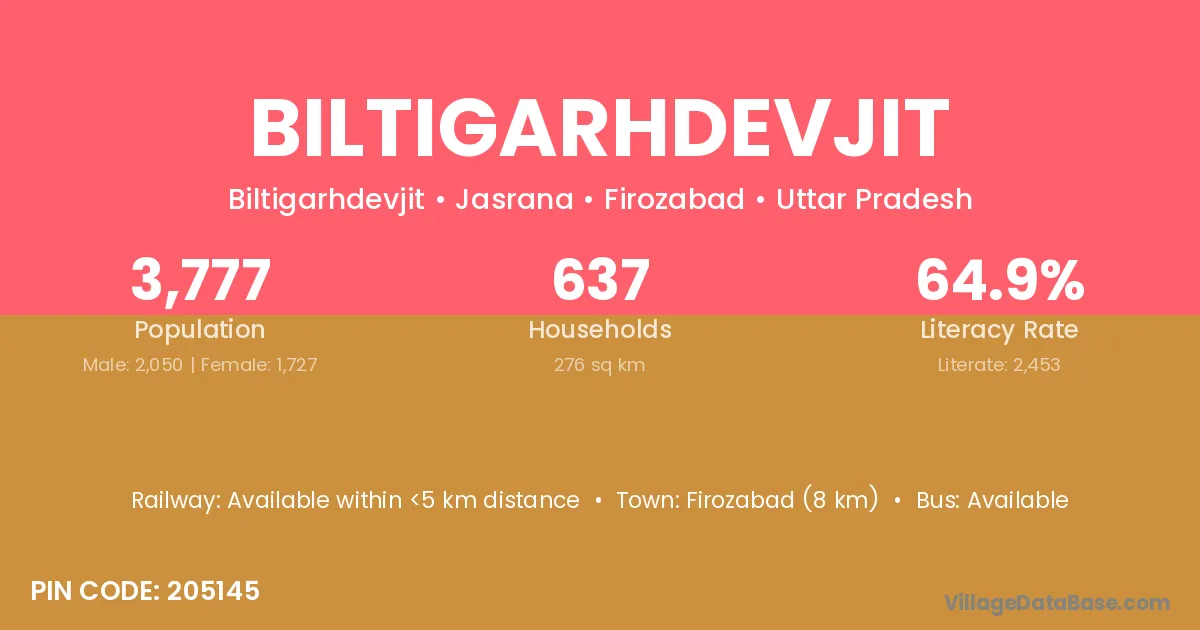Firozabad (8 km) is the nearest town to Biltigarhdevjit village for major economic activities and is located approximately 8 km away.